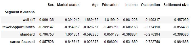df_segm_analysis = df_std.groupby([‘Segment K-means’]).mean()