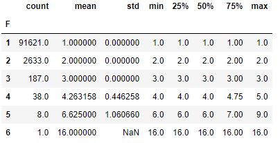 rfm_data.groupby(‘F’)[‘frequency’].describe()