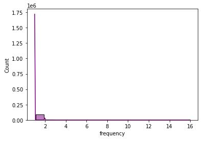sns.histplot(x=’frequency’, data=rfm_data, kde=True,color=”purple”,shrink=.8,binwidth=1)