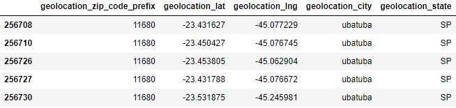 geolocation[geolocation[‘geolocation_zip_code_prefix’] == 11680].head()