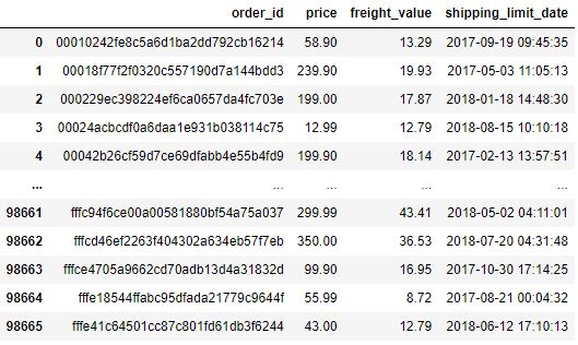 order_items = pd.read_csv(‘olist_order_items_dataset.csv’)