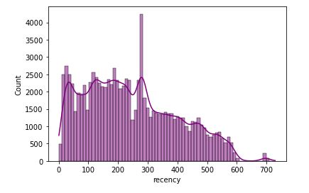 sns.histplot(x=’recency’, data=rfm_data, kde=True,color=”purple”)
