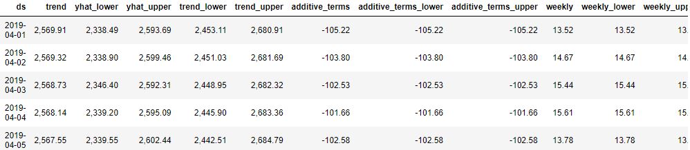 stock_price_forecast = stock_price_forecast[[‘ds’, ‘yhat’, ‘yhat_lower’, ‘yhat_upper’]]