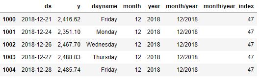 stock_price[‘dayname’] = stock_price[‘ds’].dt.day_name()