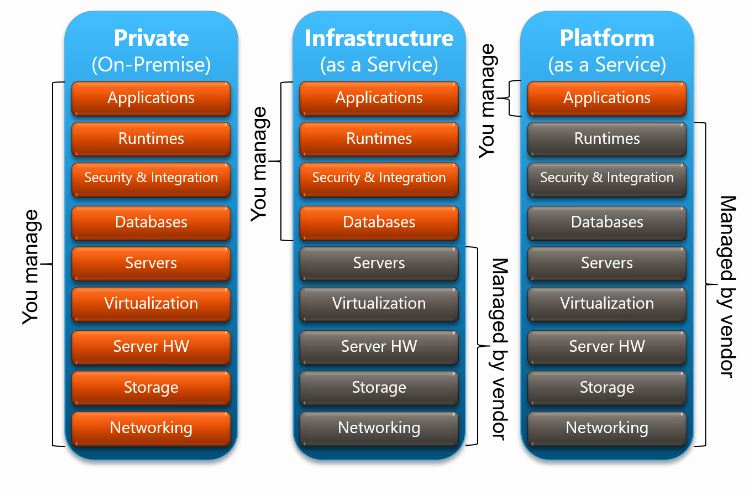 - On-premises: represents the traditional model of purchasing/licensing and acquiring software, install them, and manage them in our own data centers