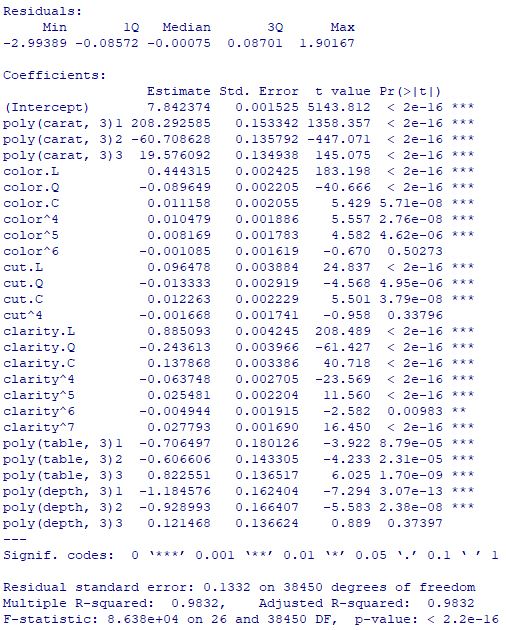poly <- lm(log_price ~ poly(carat,3) + color + cut + clarity + poly(table,3) + poly(depth,3), diamonds_train)