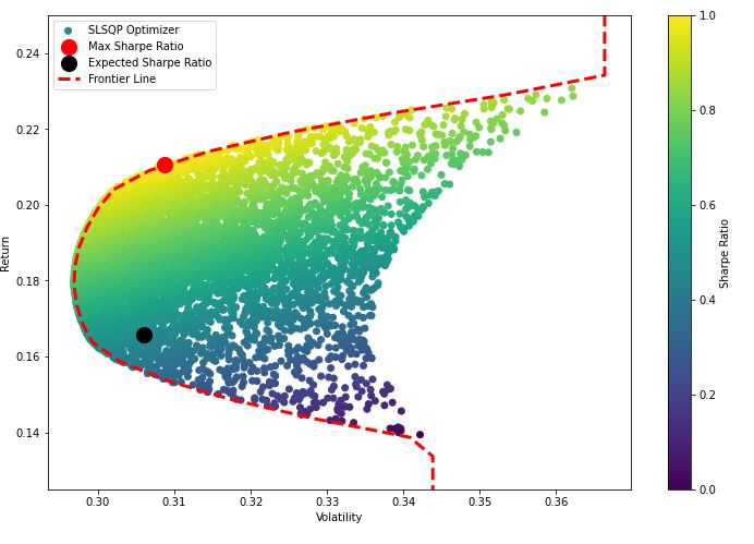 plt.legend([‘SLSQP Optimizer’, ‘Max Sharpe Ratio’,’Expected Sharpe Ratio’,’Frontier Line’])