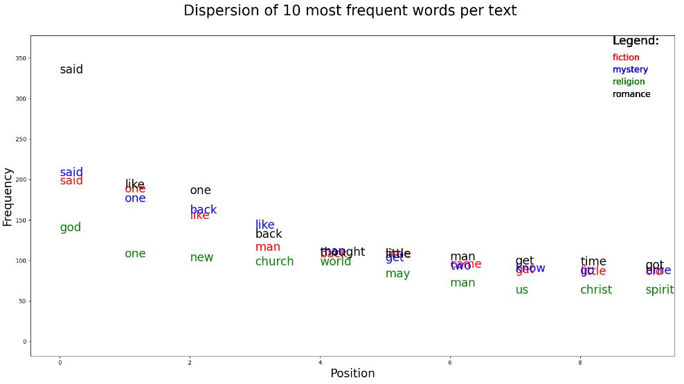 We can see that romance/religion text contains the most/least frequently used words than the other texts.