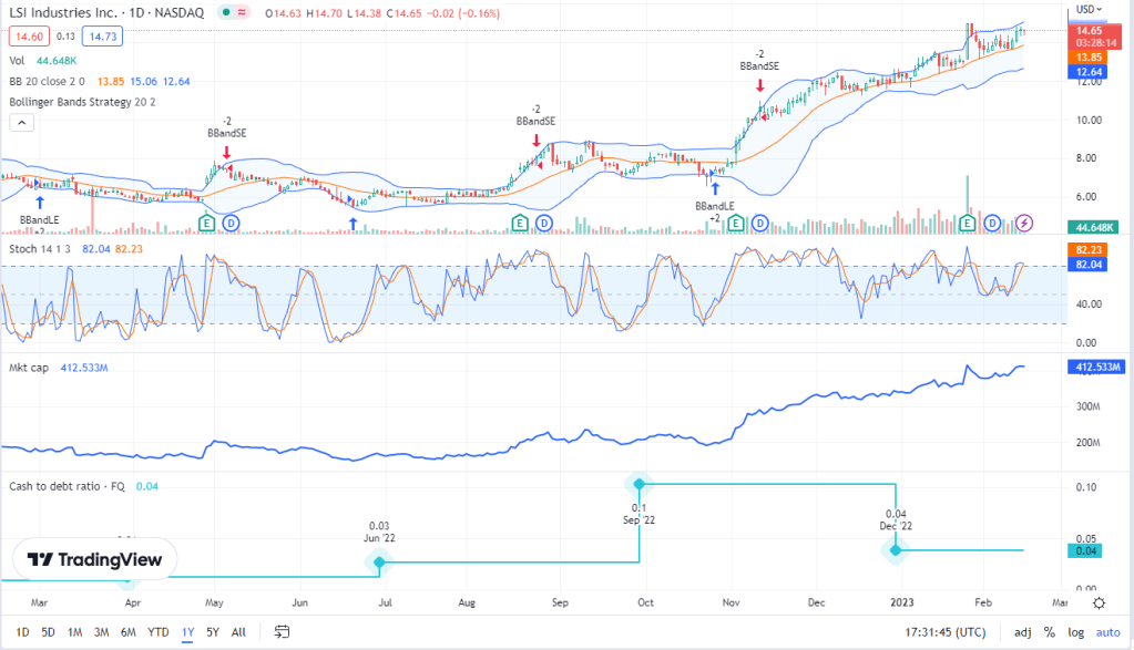1Y LYTS stock price USD with Bollinger Bands strategy, Stochastic Oscillator (SO) and the market cap (MC).