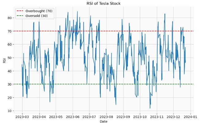 - Calculating and plotting the RSI indicator for TSLA