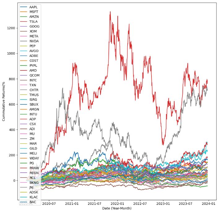 tickers = ["AAPL", "MSFT", "AMZN", "TSLA", "GOOG", "XOM", "META", "NVDA", "PEP", "AVGO", "ADBE", "COST", "PYPL", "AMD", "QCOM", "INTC", "TXN", "CHTR", "TMUS", "ISRG", "SBUX", "AMGN", "INTU", "ADP", "CSX", "ADI", "MU", "ZM", "MAR", "GILD", "MELI", "WDAY", "PG", "PANW", "REGN", "RCL", "BKNG", "JNJ", "ADSK", "KLAC", "BAC"]